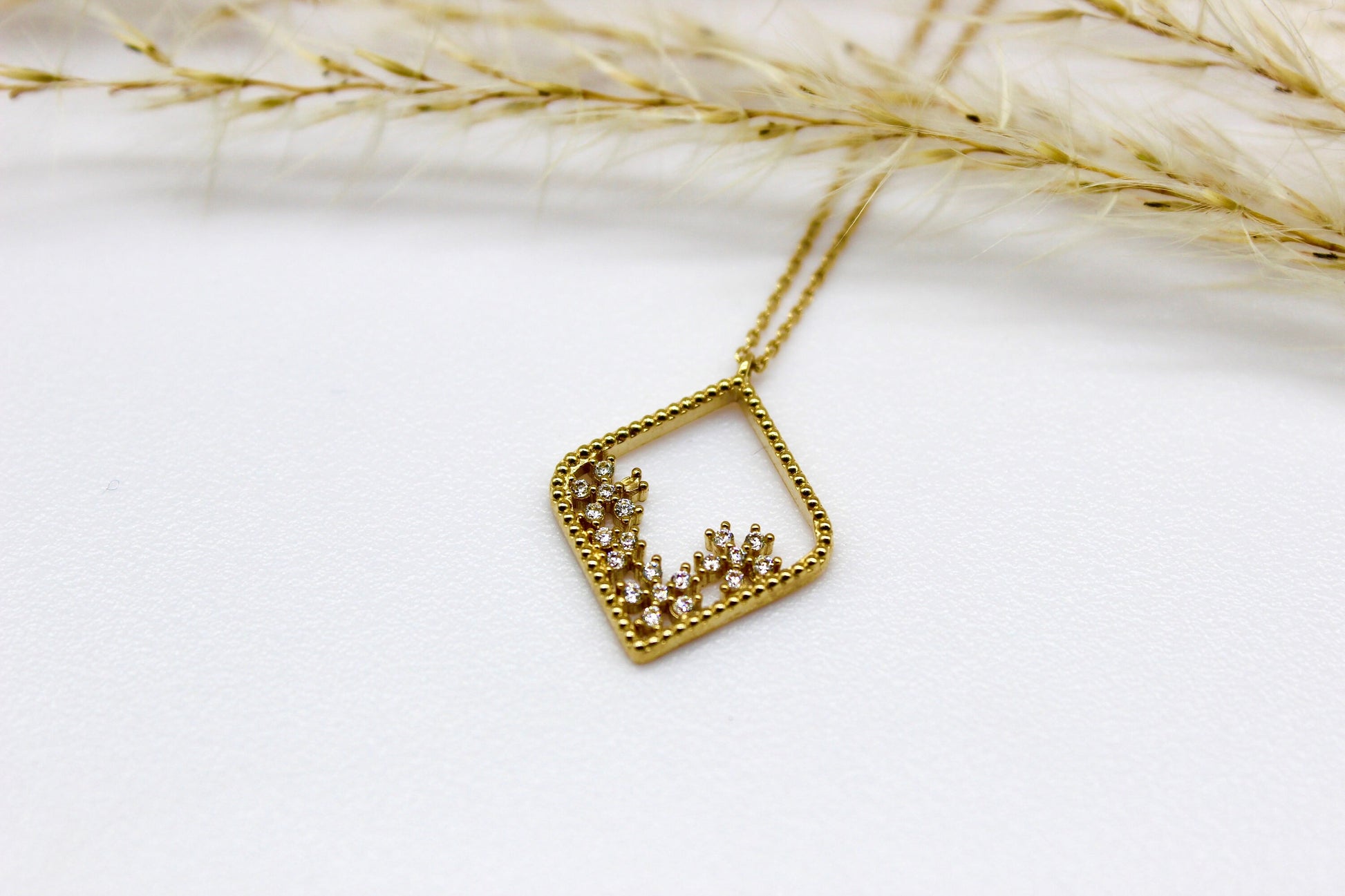 Entdecken Sie unsere verstellbare Halskette aus 14K Gelbgold, die mit einem atemberaubenden Anhänger in Raute-Form verziert ist. Dieser Anhänger ist mit funkelnden Zirkonia-Steinen besetzt, die ein bezauberndes Schneeflocken-Design bilden und Ihrem Look einen Hauch von winterlicher Eleganz verleihen.