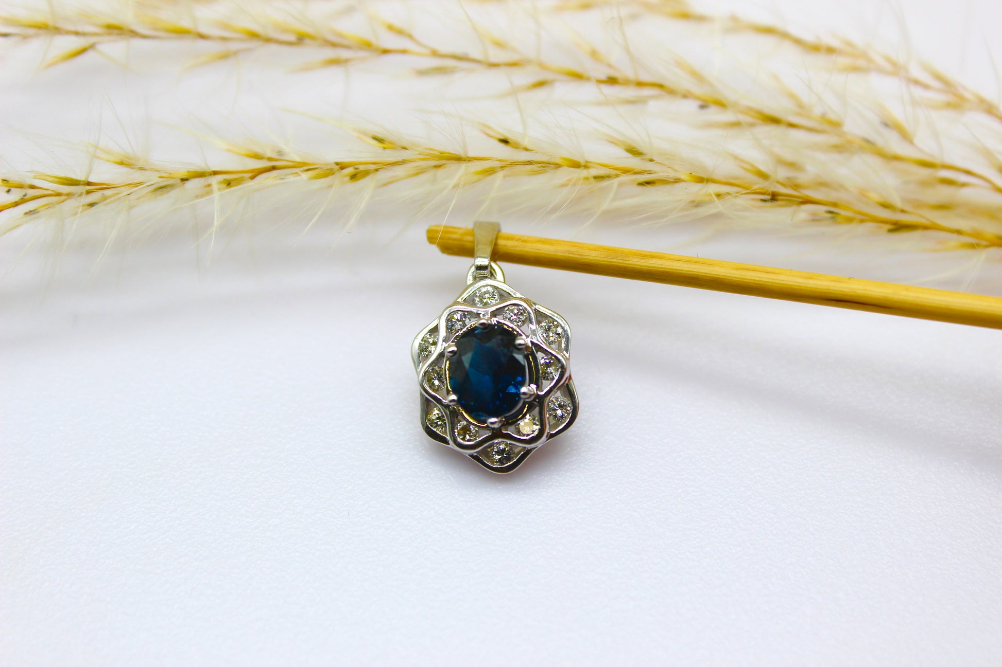 Saphir Anhänger in 14k Weissgold verziert mit 12 Brillanten in Sternen-Muster Fassung