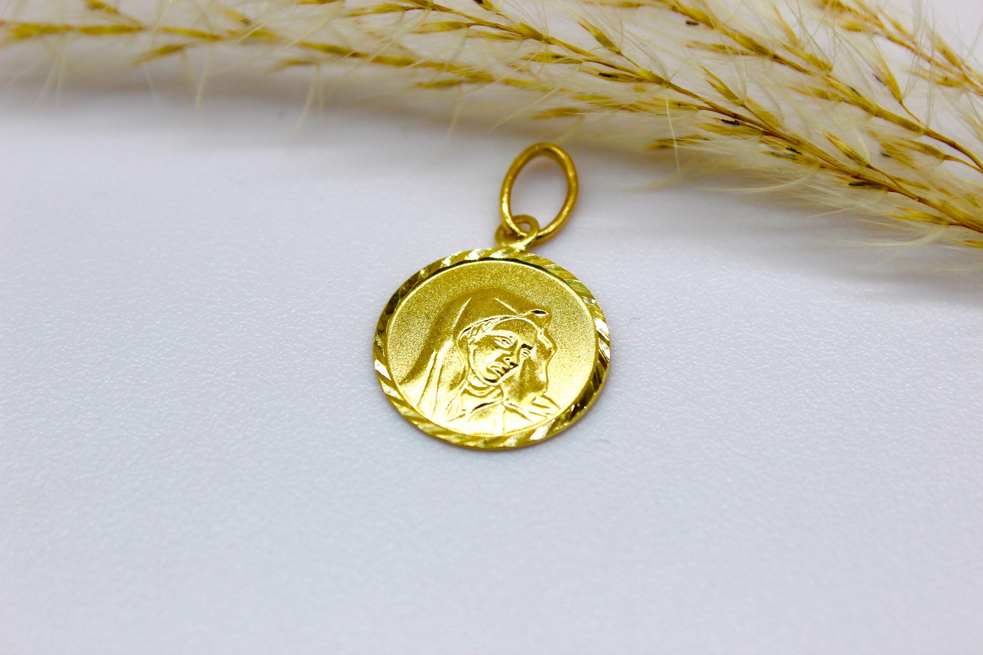 Dieser exquisite Rundplatten Anhänger aus hochwertigem 14 Karat Gelbgold ist eine wunderschöne Hommage an die Mutter Maria. Mit einem Durchmesser von 1,7 cm ist dieser Anhänger subtil und dennoch von bedeutender Präsenz.