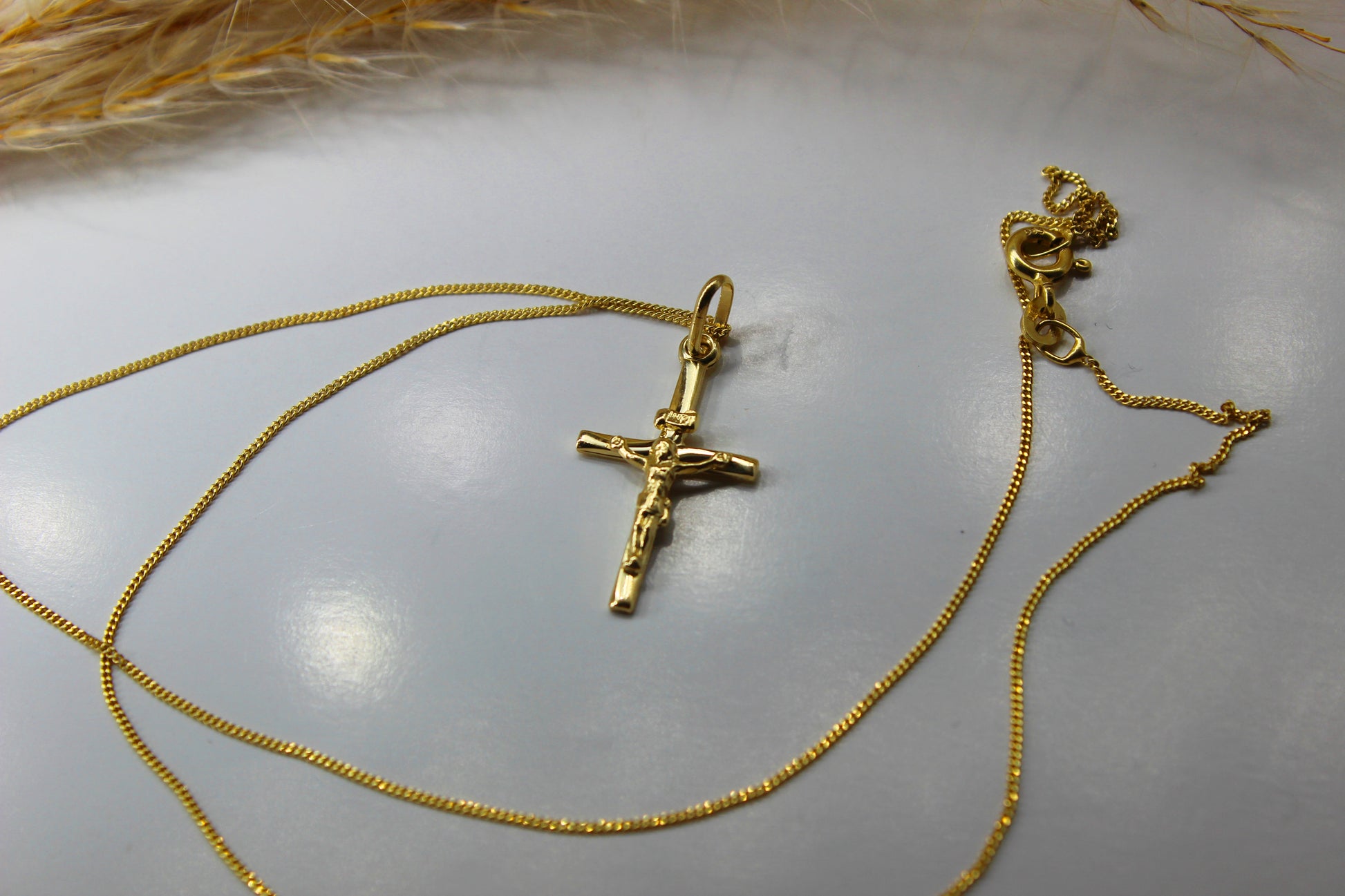 Unser Kreuz Anhänger mit Jesus in 585 Gelbgold ist ein beeindruckendes religiöses Symbol. Das Kreuz, mit einer Länge von ca. 2 cm, ist kunstvoll gestaltet und enthält eine Darstellung von Jesus. Optional kann eine Panzerkette im passenden Stil ausgewählt werden, um das Ensemble zu vervollständigen.