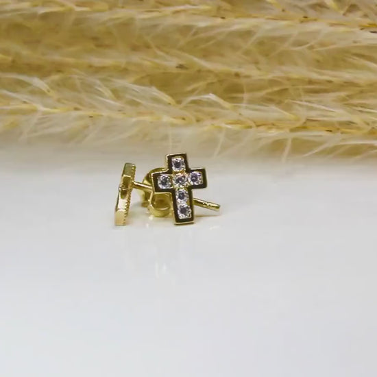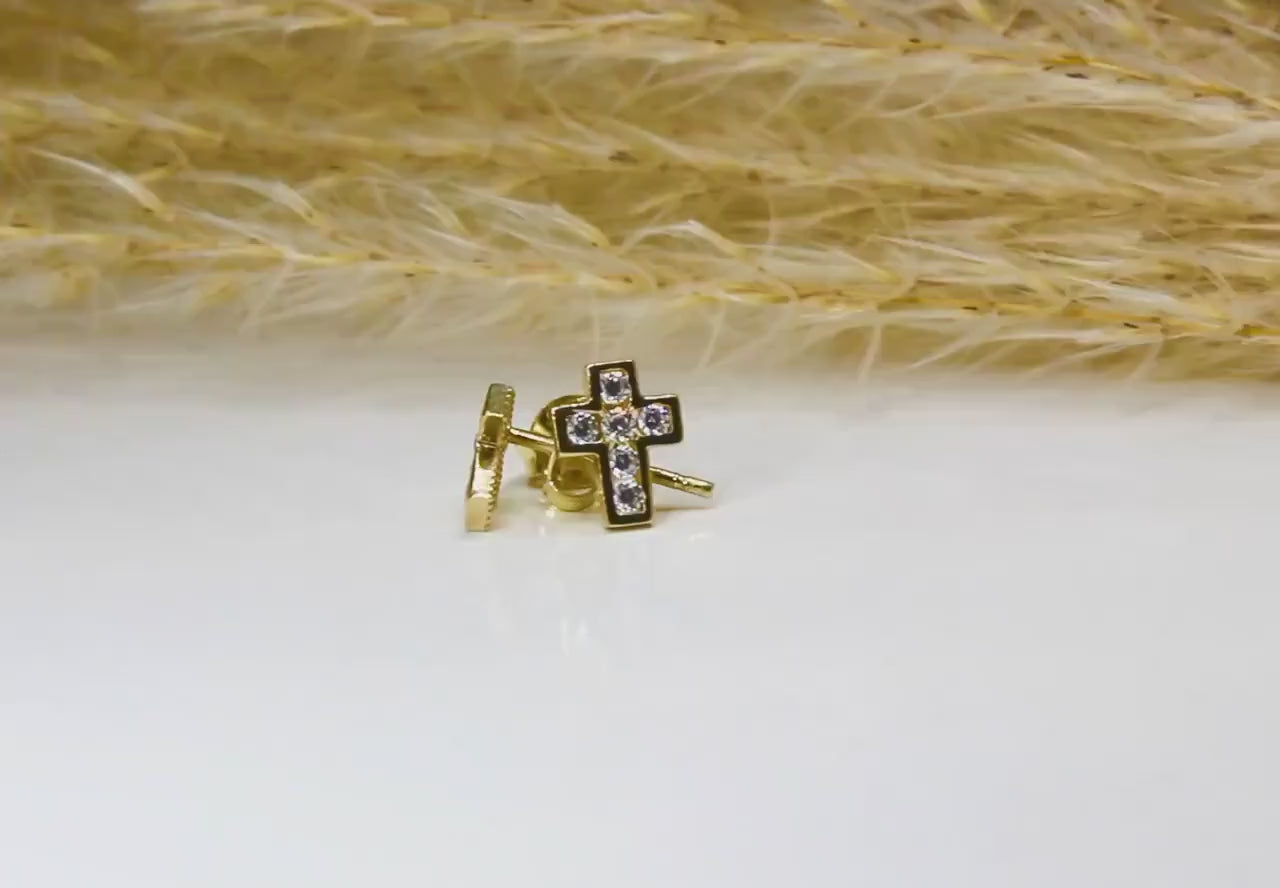 Our simple 585 yellow gold cross stud earrings with cubic zirconia stones are a sparkling and spiritual piece of jewelry that elegantly expresses your faith and elegance.