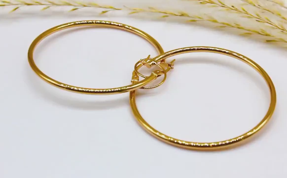 The hoop earrings have a wire diameter of 2 mm, giving them a sleek yet sturdy appearance. Their rounded shape gives them a soft aesthetic and makes them a versatile accessory for different outfits and occasions.