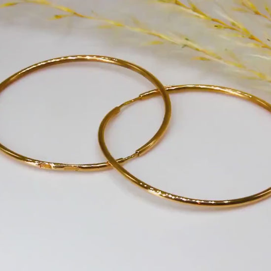 Crafted from high-quality 14k rose gold, these simple hoop earrings are timeless yet elegant. Measuring 3.5cm in diameter, they are subtle yet striking enough to add a touch of sophistication.