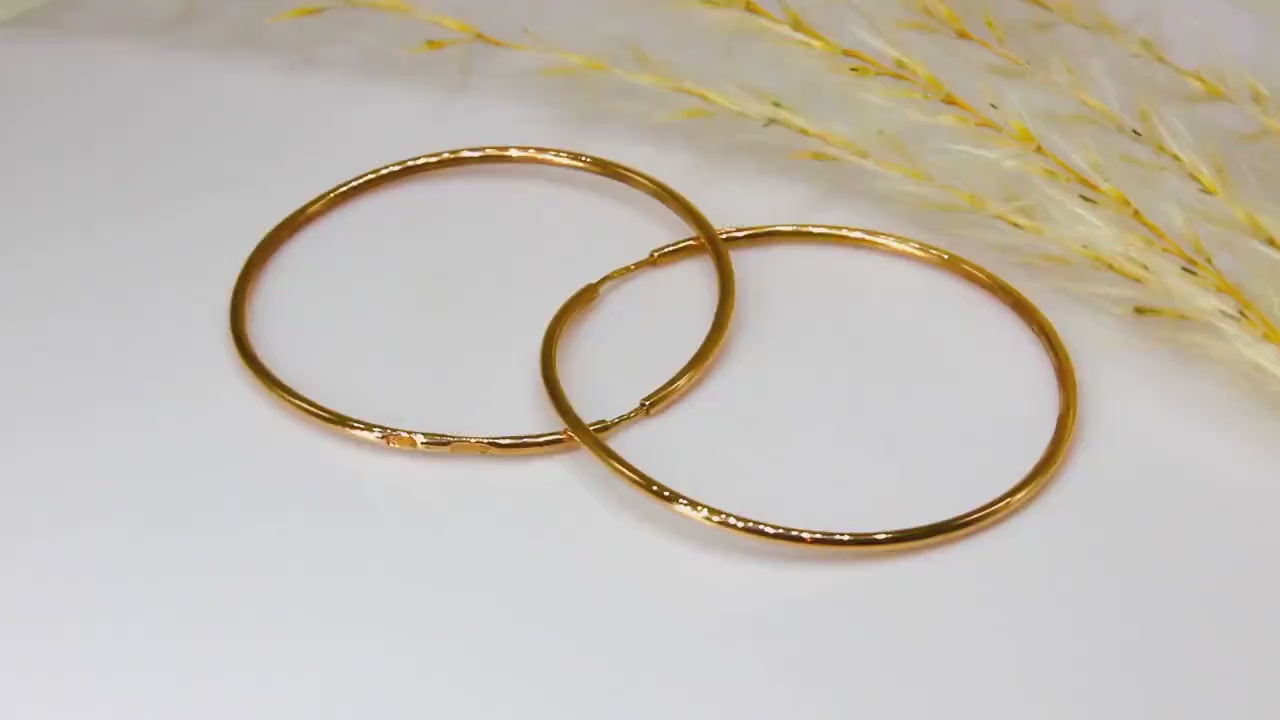 The hoop earrings have a wire diameter of 1.3 mm, giving them a sleek yet sturdy appearance. Their rounded shape gives them a soft aesthetic and makes them a versatile accessory for different outfits and occasions.