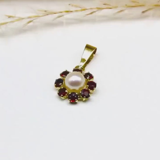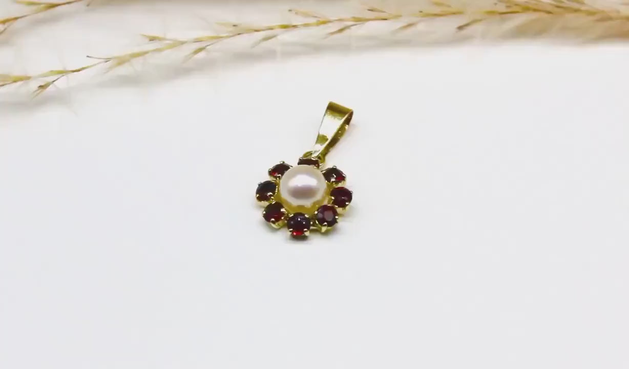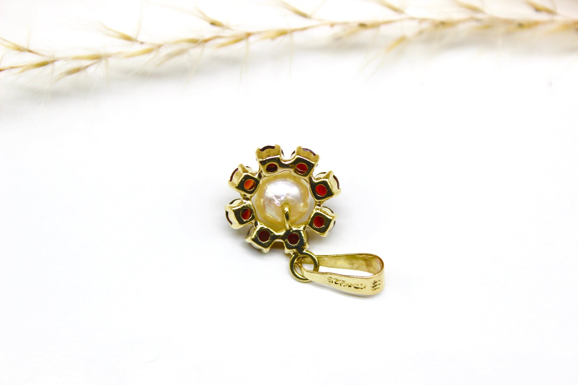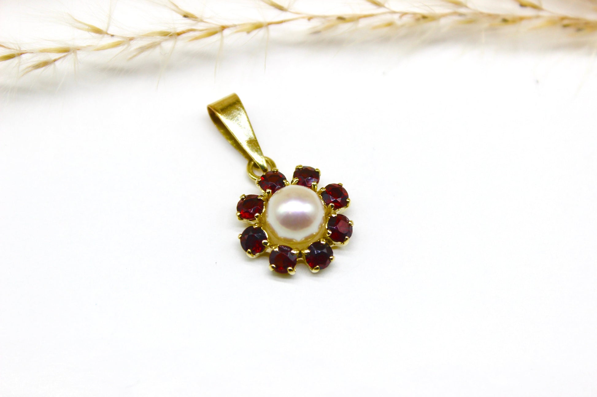 Vintage 8K Gold Anhänger mit Perle umrandet von Granat Edelsteinen in Runder Form